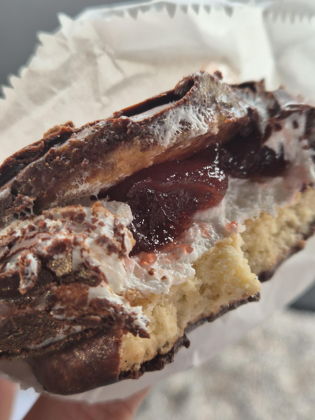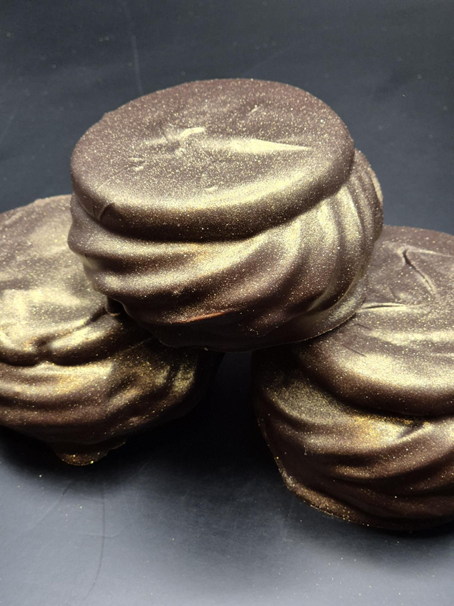 Vanilla cookies with strawberry jam and a vegan aquafaba marshmallow filling, coated in chocolate.